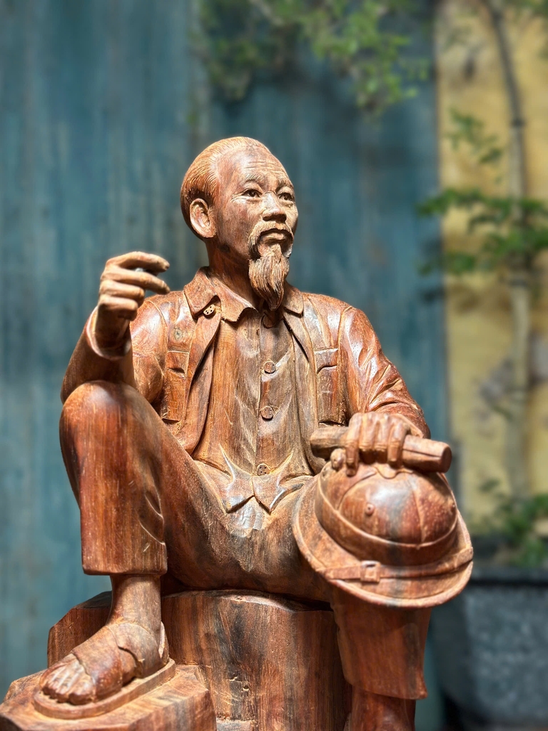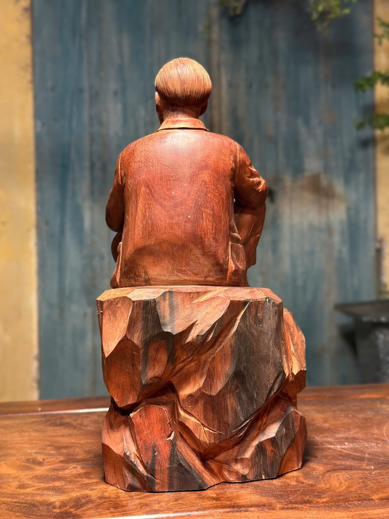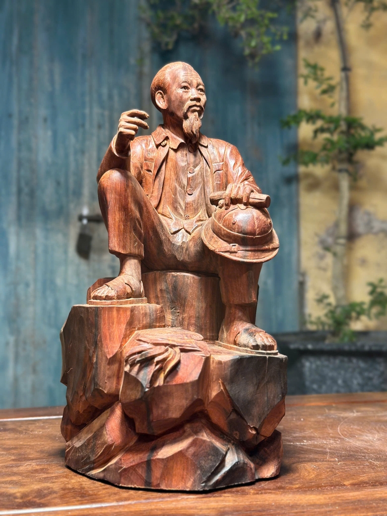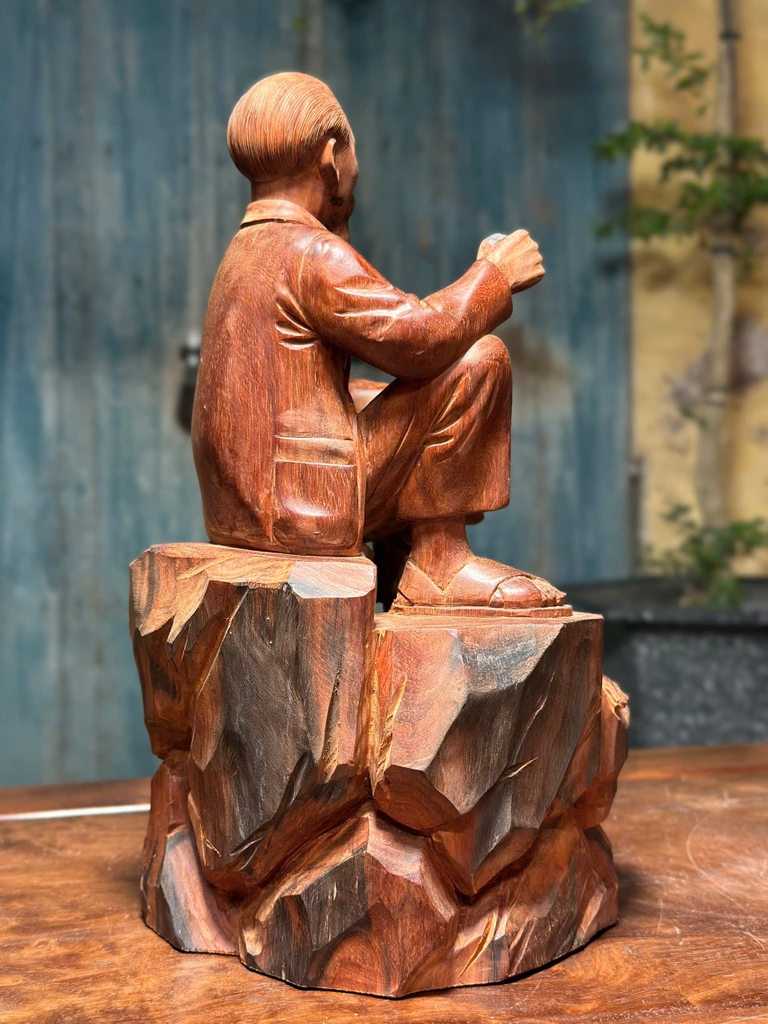 Gỗ trắc là một trong những dòng gỗ quý hiếm cao cấp trong mỹ nghệ Việt Nam, thường được sử dụng để chế tác các tác phẩm tượng có giá trị nghệ thuật và sưu tầm cao. Khi ứng dụng vào tượng Bác Hồ ngồi phiến đá, chất liệu này không chỉ nâng tầm thẩm mỹ mà còn thể hiện sự trang trọng và bền bỉ theo thời gian.